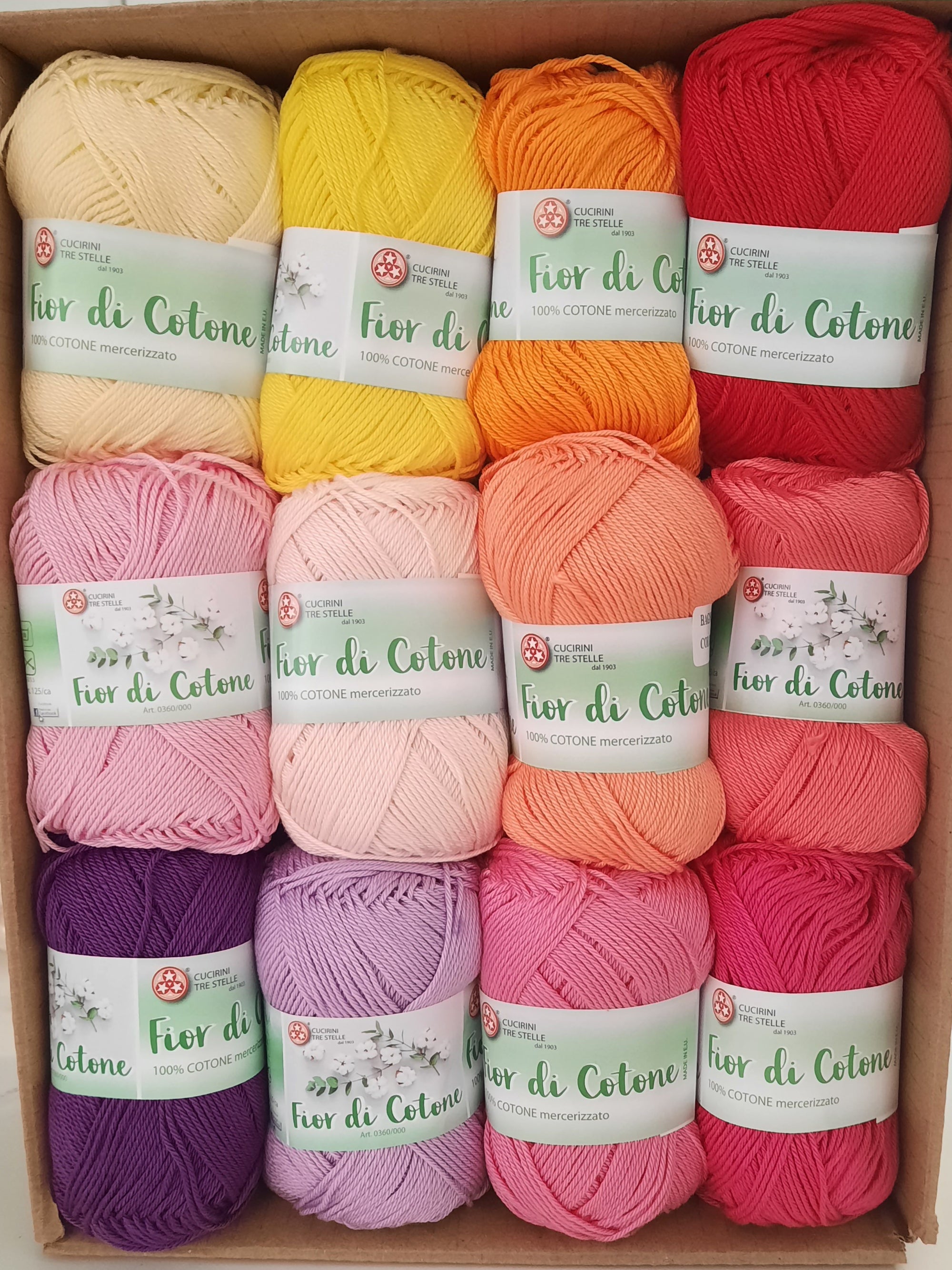 100% mercerized gassed combed cotton. Ideal for any processing. Solid colors. the ball weighs 50g for 125 meters. We recommend working it with needles and 2.5 / 3.5mm crochet hooks. USA 4-5. The kit consists of 12 balls of assorted colors as in the photo. Ideal for making Granny squares or any other project!