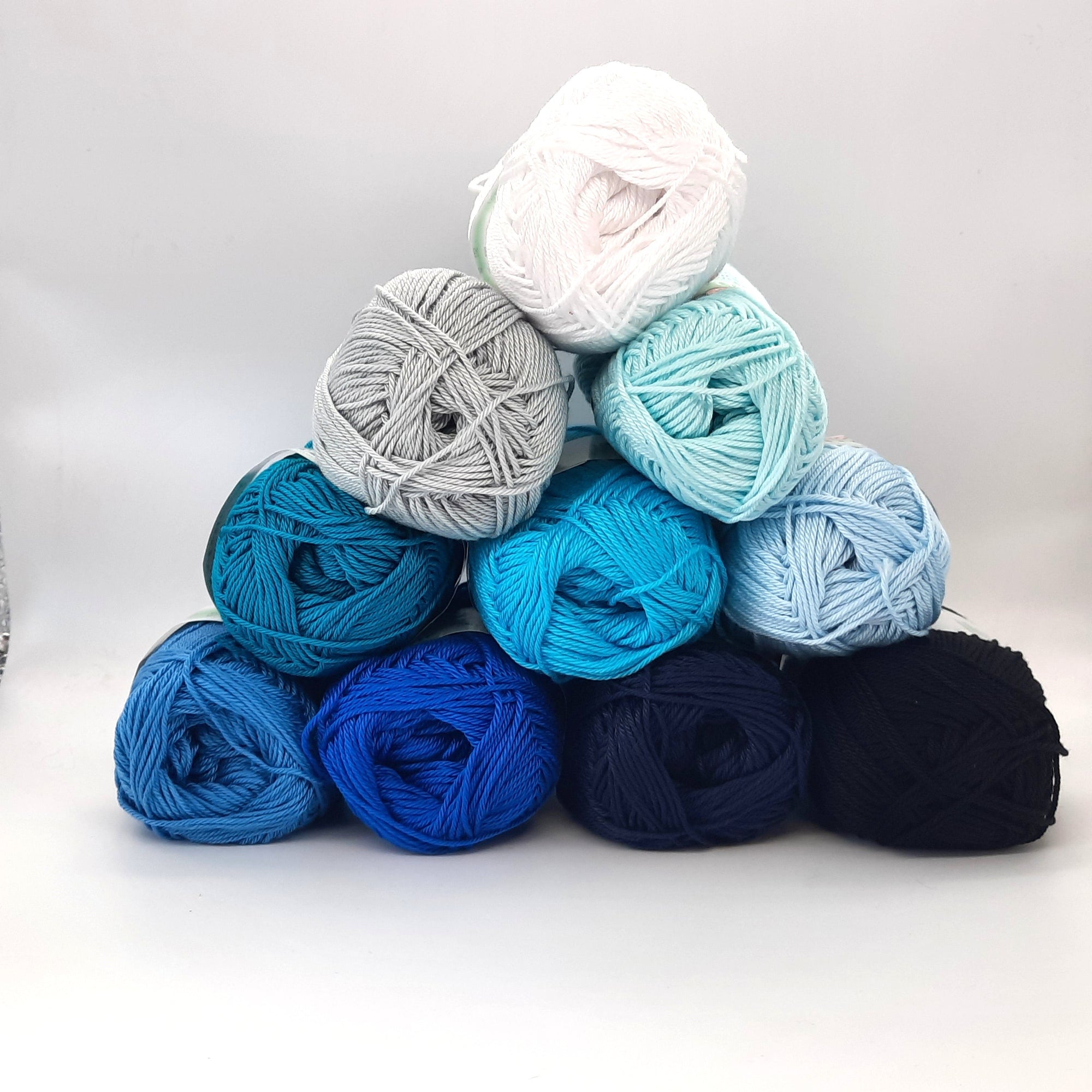 100% mercerized gassed combed cotton. Ideal for any processing. Solid colors. the ball weighs 50g for 125 meters. We recommend working it with needles and 2.5 / 3.5mm crochet hooks. USA 4-5. The kit consists of 10 balls of assorted colors as in the photo. Ideal for making Granny squares or any other project!