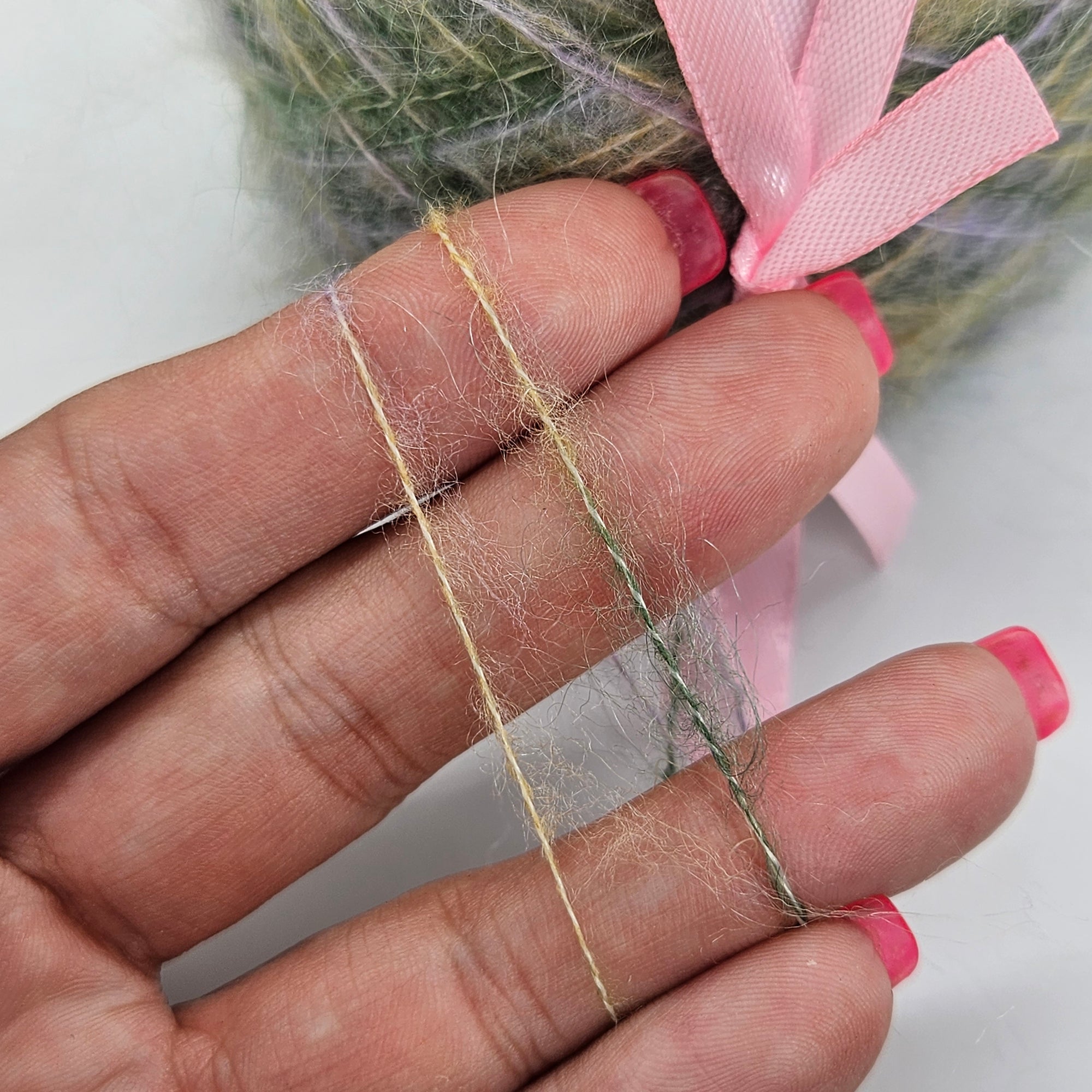 Marzia printed è un morbido e fantasioso filato composto da 30% mohair 4% lana 36% acrilico 30% nylon. L'effetto che si ottiene è maculato, i colori spaziano dal verde al lilla al giallo. Viene spedito in cake da 25gr per 225 metri. Consigliamo di lavorarlo morbido con ferri e uncinetti 2/3mm