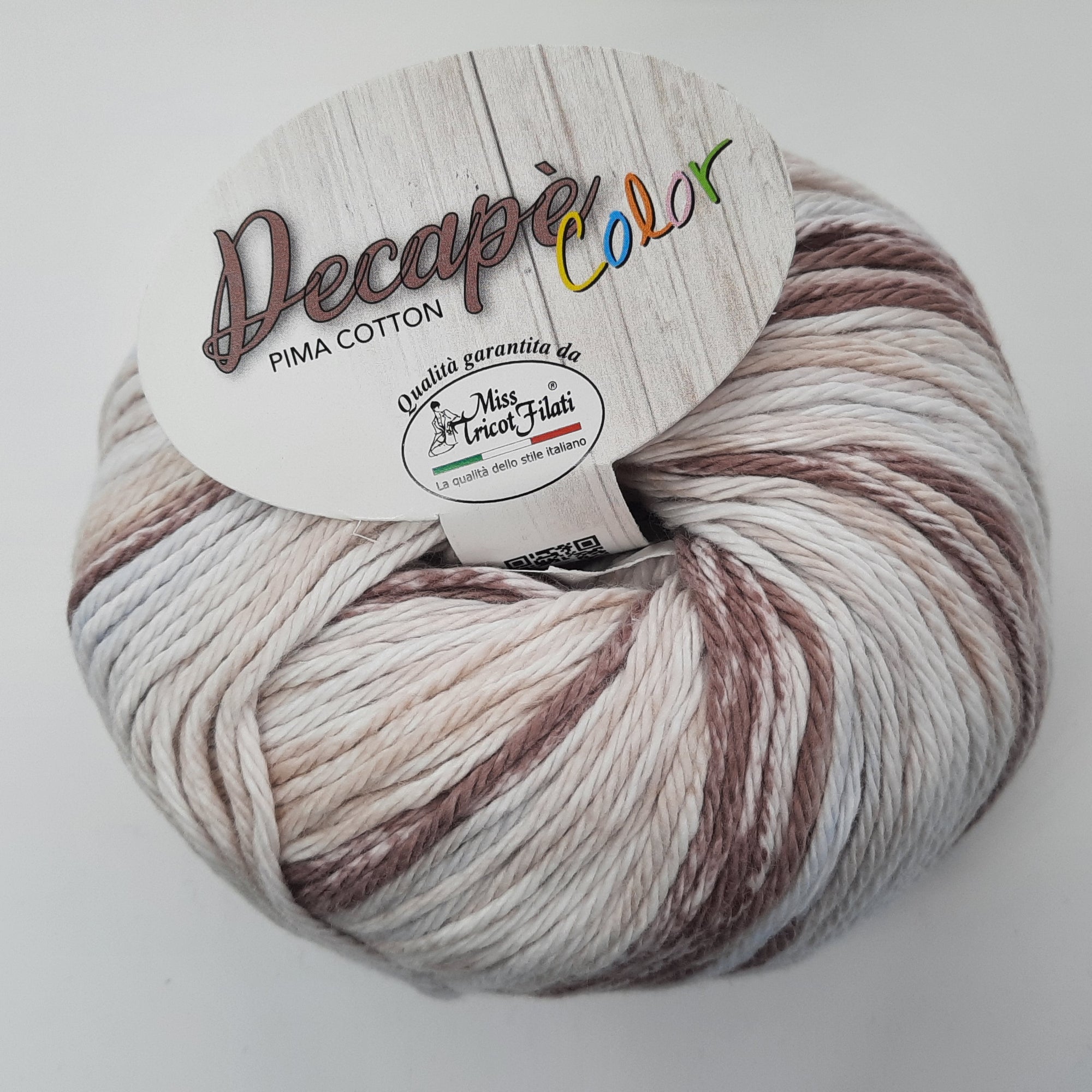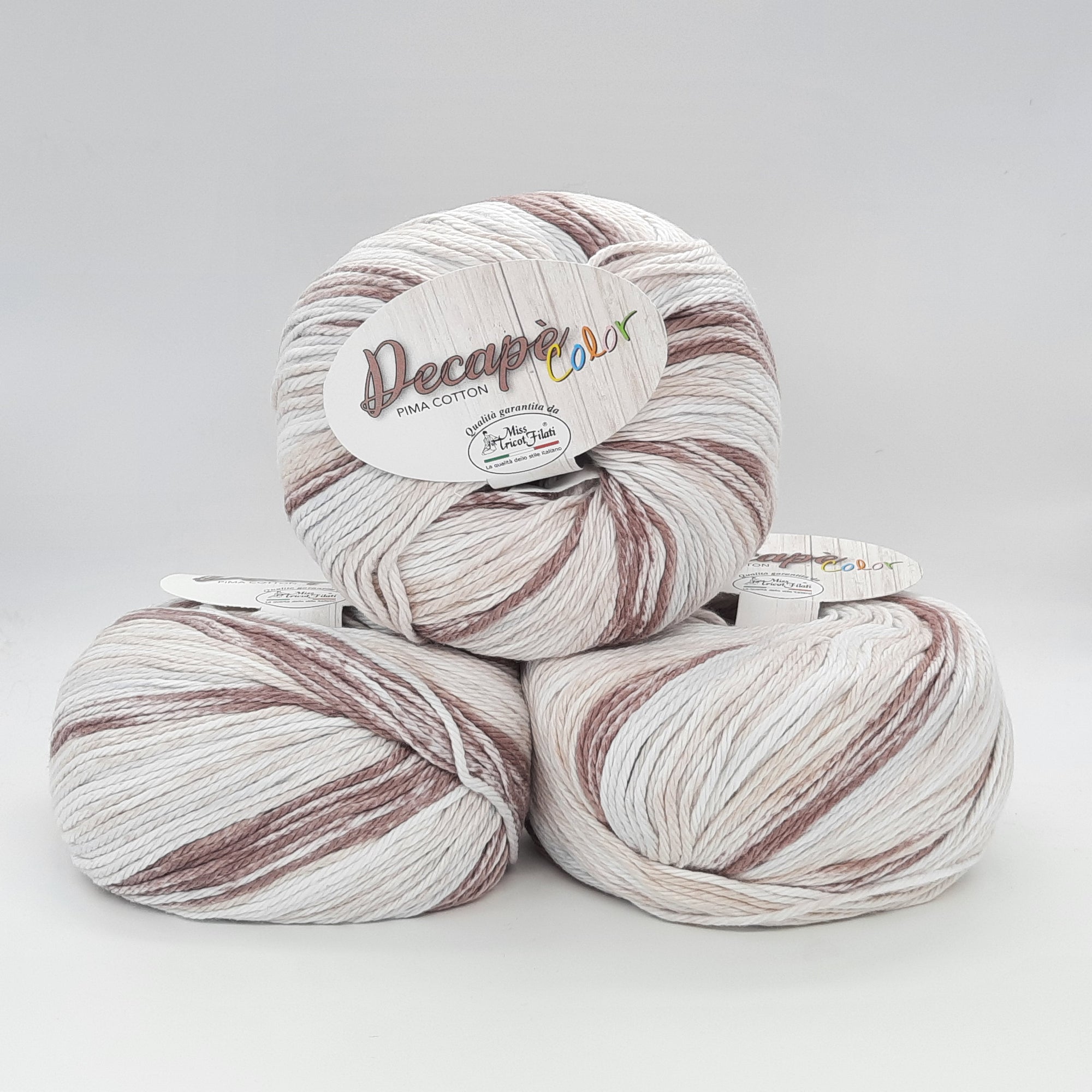 Decapè Color est un fil 100% coton pima doux et précieux. Le coton Pima est considéré comme l'or du Pérou, les fibres dont il dispose sont plus longues que les autres cotons et le rendent brillant, doux et très résistant à l'usure. Idéal pour la confection de vêtements pour adultes et bébés, il est frais et polyvalent. Il est expédié en pelotes de 100gr pour 170mt, nous vous recommandons de le travailler avec des aiguilles à tricoter et des crochets 4,5 / 5mm