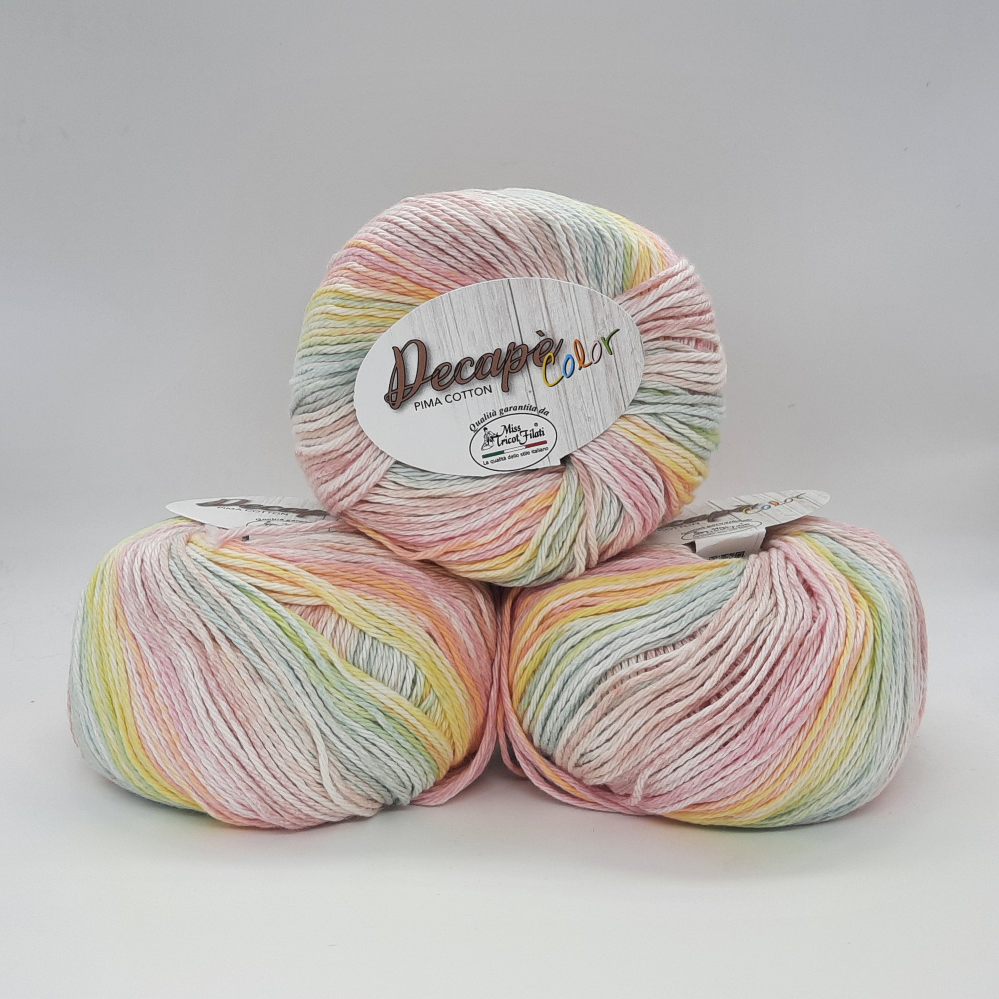 Decapè Color est un fil 100% coton pima doux et précieux. Le coton Pima est considéré comme l'or du Pérou, les fibres dont il dispose sont plus longues que les autres cotons et le rendent brillant, doux et très résistant à l'usure. Idéal pour la confection de vêtements pour adultes et bébés, il est frais et polyvalent. Il est expédié en pelotes de 100gr pour 170mt, nous vous recommandons de le travailler avec des aiguilles à tricoter et des crochets 4,5 / 5mm