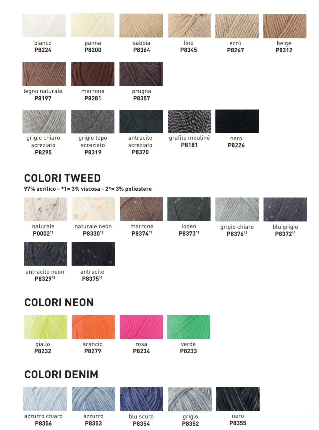 Gomitolo in 100% acrilico Perfetto di Mez Cucirini, ideale per qualsiasi lavorazioni, 100 colori disponibili. Il gomitolo pesa 50gr per 133 metri. Consigliamo di lavorarlo con ferri e uncinetti 3/4mm. Ideale anche per la lavorazioni tufting e per fare tappeti. Lavabile in lavatrice. Si consiglia di acquistare tutta la quantità necessaria in un solo ordine per non avere bagni colore differenti